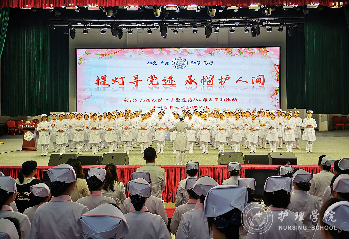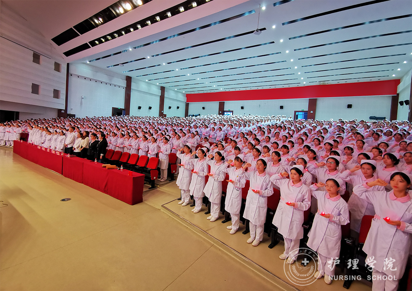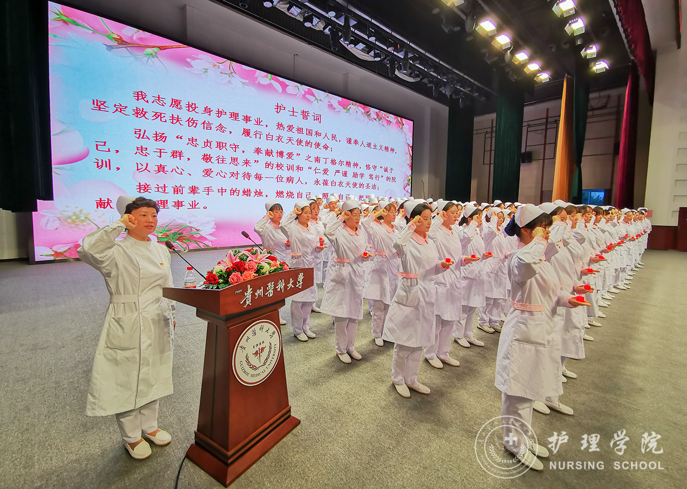 1056位护生手捧燕帽,单膝下跪,接受护理前辈为自己戴上圣洁的燕帽、点燃手中的红烛,这庄严而又神圣的时刻象征着贵医护理人的代代传承。“我宣誓:我志愿投身护理事业,热爱祖国和人民,谨奉人道主义精神,坚定救死扶伤信念,履行白衣天使的使命……”在王秀红的带领下,全体与会人员庄严宣誓,齐唱《中国护士之歌》。