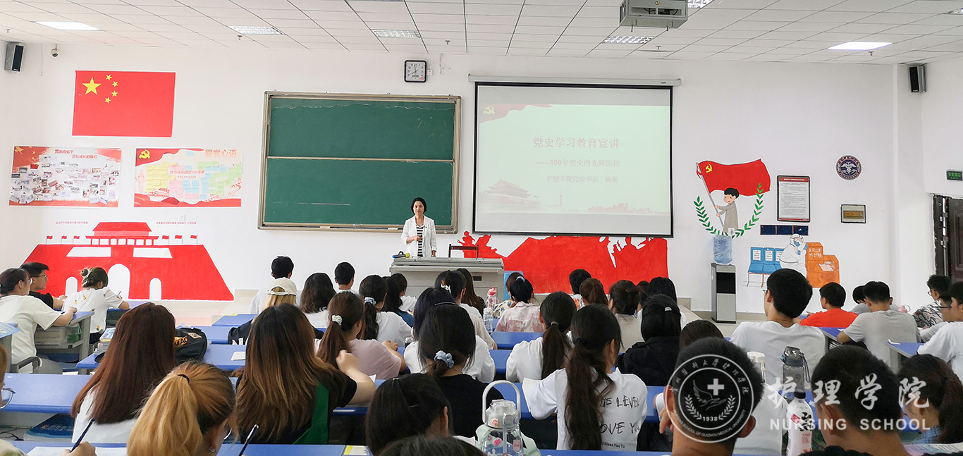 6月30日,为庆祝中国共产党建党100周年,深入学习中国共产党百年奋斗史,切实推进党史学习教育深入开展。kaiyun开云官方网站党委书记杨英在南校区广德楼X1504教室为kaiyun开云官方网站2019级护理学丙班开展党史学习教育宣讲,全体同学参加。