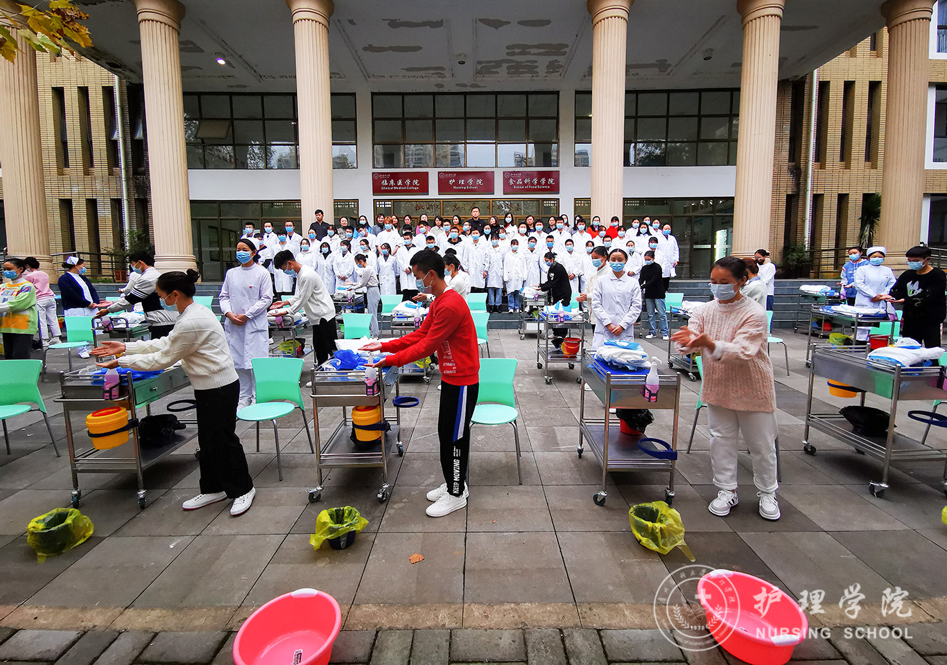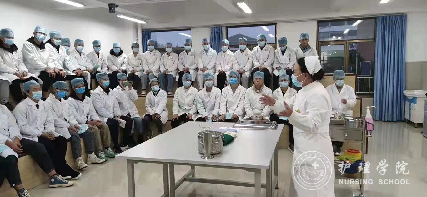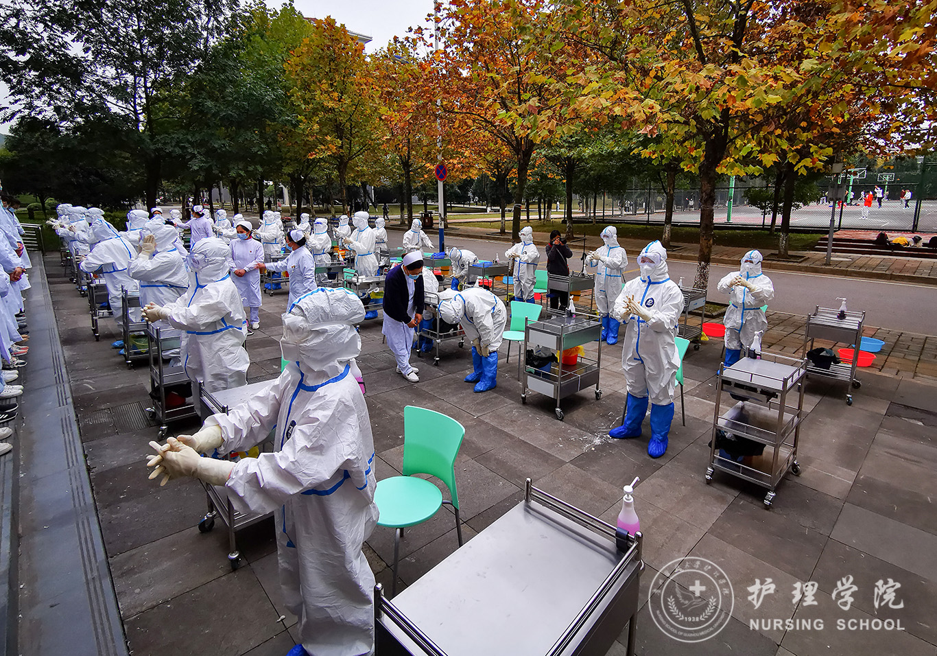 百川楼1楼小操场上,整齐摆放着30台治疗车,学生教练员早已准备就绪,随着老师一声令下,学生教练员开始现场演示如何正确穿脱防护服,他们个个认真、细心、严谨,展示了娴熟的操作技能。穿脱防护服演示结束后,开云基础护理学教研室的资深教师、学生最喜爱的肖霓老师,在百川楼三楼kaiyun开云官方网站示教室为协和班的同学进行了一场无菌操作示教活动,本次示教活动采取理论和实践相结合,生动形象的将无菌操作技术展现在同学们眼前,同学们均表示收获满满。最后,在获得防疫相关理论知识的基础上,kaiyun开云官方网站的30名学生教练员在模拟实验室开始对协和班的同学就如何正确穿脱防护服和采取咽拭子进行“一对一”指导和考核。
