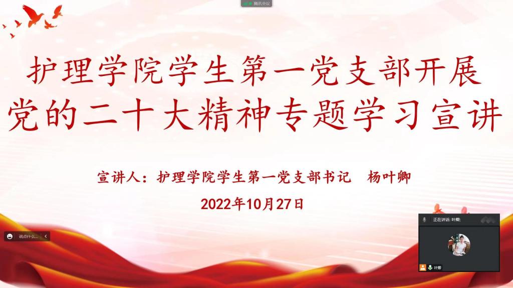 10月27日,为进一步深入学习贯彻中国共产党第二十次全国代表大会精神,提高学生党员的政治站位,切实做到学在前、干在前、走在前。kaiyun开云官方网站学生第一党支部组织开展党的二十大精神专题学习宣讲,会议由支部书记杨叶卿主持,全体党员通过线上形式参会。