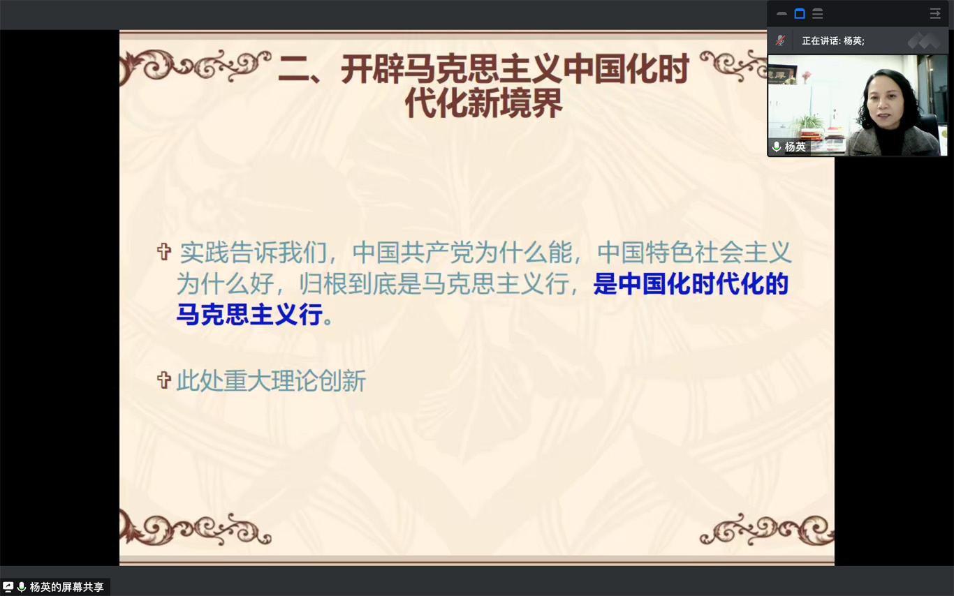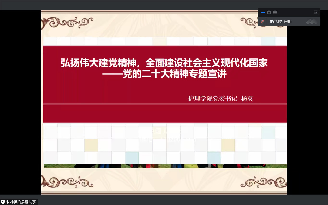 12月10日,为深入学习贯彻党的二十大精神,引导学生党员认真学习,领悟精神实质,kaiyun开云官方网站党委书记杨英以“弘扬伟大建党精神,全面建设社会主义现代化国家”为主题在kaiyun开云官方网站学生第一党支部宣讲党的二十大精神,会议由支部书记杨叶卿主持,全体支部党员、 入党积极分子通过腾讯会议参加本次宣讲。