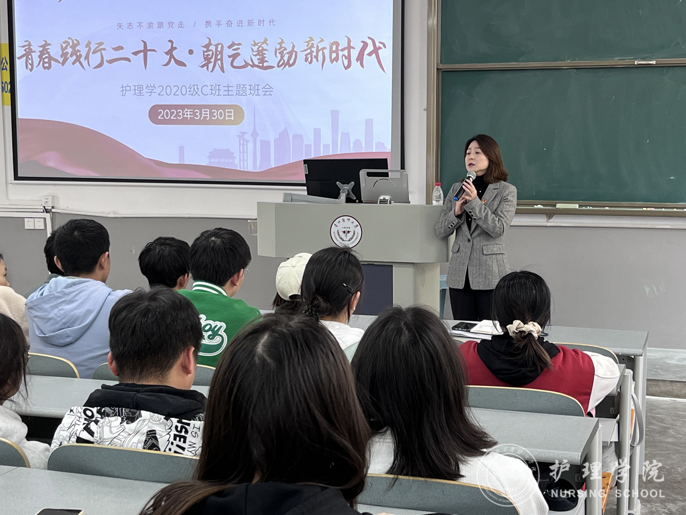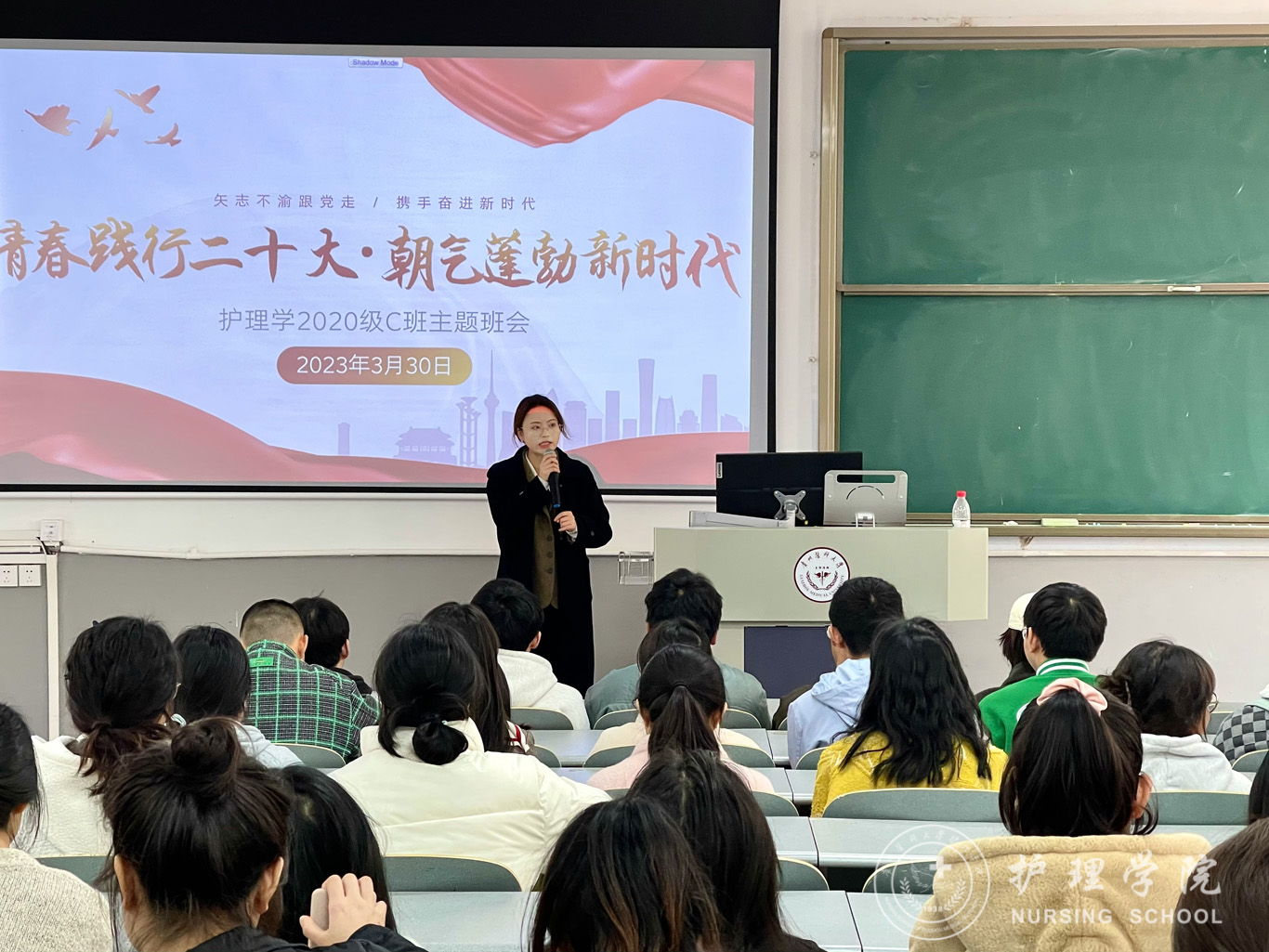 3月30日,为深入学习宣传贯彻党的二十大精神,强化思想引领,聚焦立德树人根本任务。kaiyun开云官方网站党委委员、副处级组织员张黎到护理学2020级C班开展了“青春践行二十大,朝气蓬勃新时代”主题班会活动,会议由辅导员刘妍主持,班级全体同学参与。