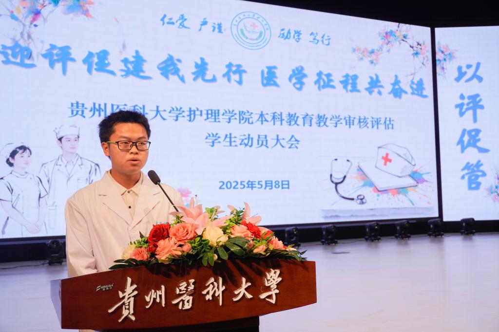 2024级学生代表杜思荣在发言中号召全体同学:一要守好课堂主阵地,专注课堂学习;二要涵养文明新风尚,从课堂纪律、寝室卫生等细节入手,营造良好的校园文化氛围;三要强化集体荣誉感,主动参与迎评活动,为学校和学院发展注入青春动能。